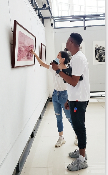 参观山水画作品,国际员工忍不住拿出手机拍照留念。